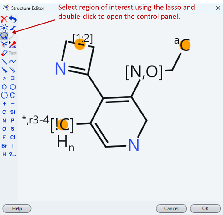 - Now select the Library to be searched and select, whether to search for superstructures or structures being similar to your query. Then double-click the Query Structure field to open the structure editor. Here you may draw or paste a (sub)structure or even a chemical name. If you have selected superstructure mode, then you can associate atoms and bonds with query features (select the lasso tool and double click atoms/bonds). You may also attach exclude groups to particular atoms, which are groups that are not allowed at this position.