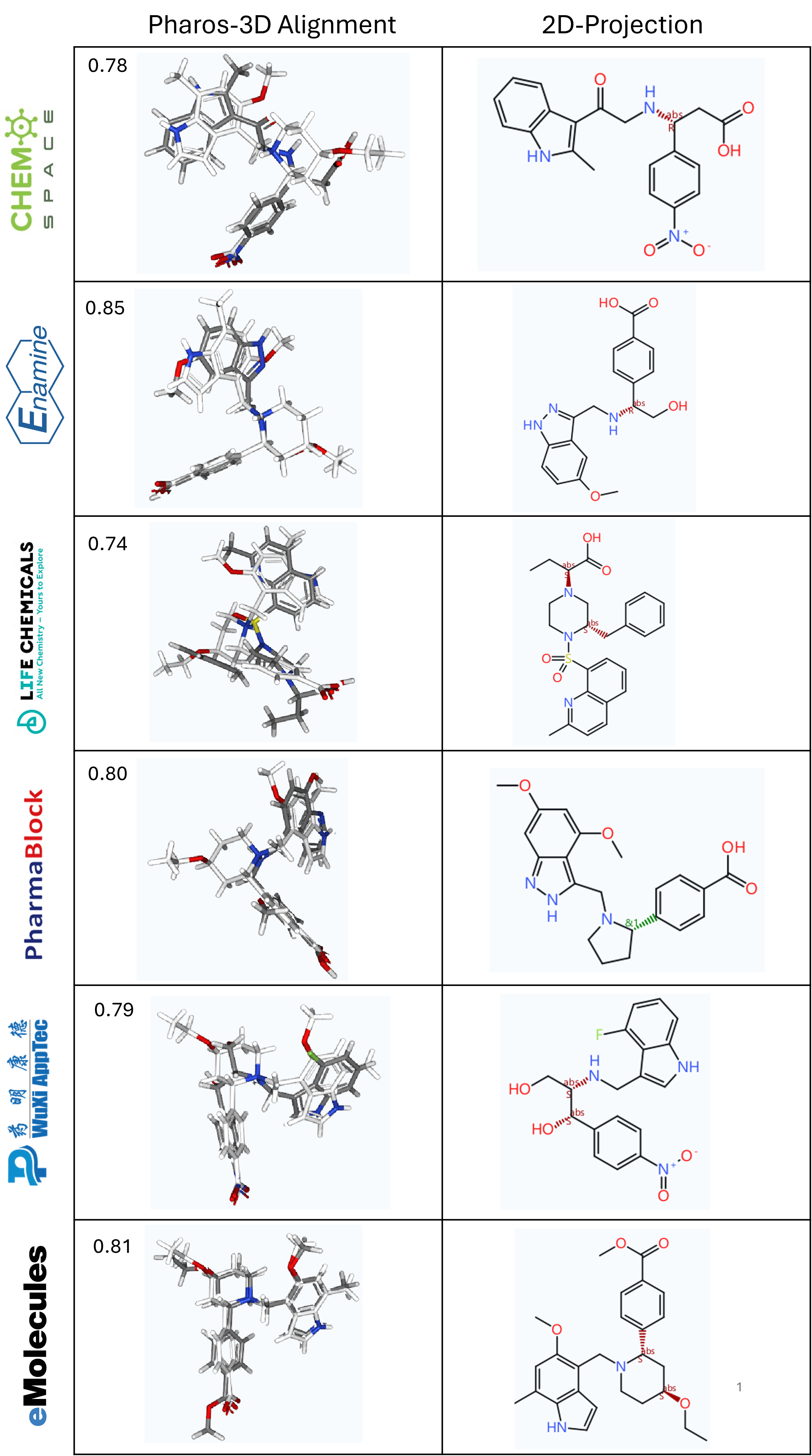 As an example result for Pharos-3D, below depicted are the best Pharos-3D alignments from each library with respect to the Pharos-3D Score together with the respective 2D projections of each compound. The Pharos-3D Score represents the shape similarity of the best matching low energy conformer to the query while considering potentially similar protein interactions. The score ranges from 0 to 1, indicating “no alignment” and “perfect alignment with equivalent interaction potential”, respectively.