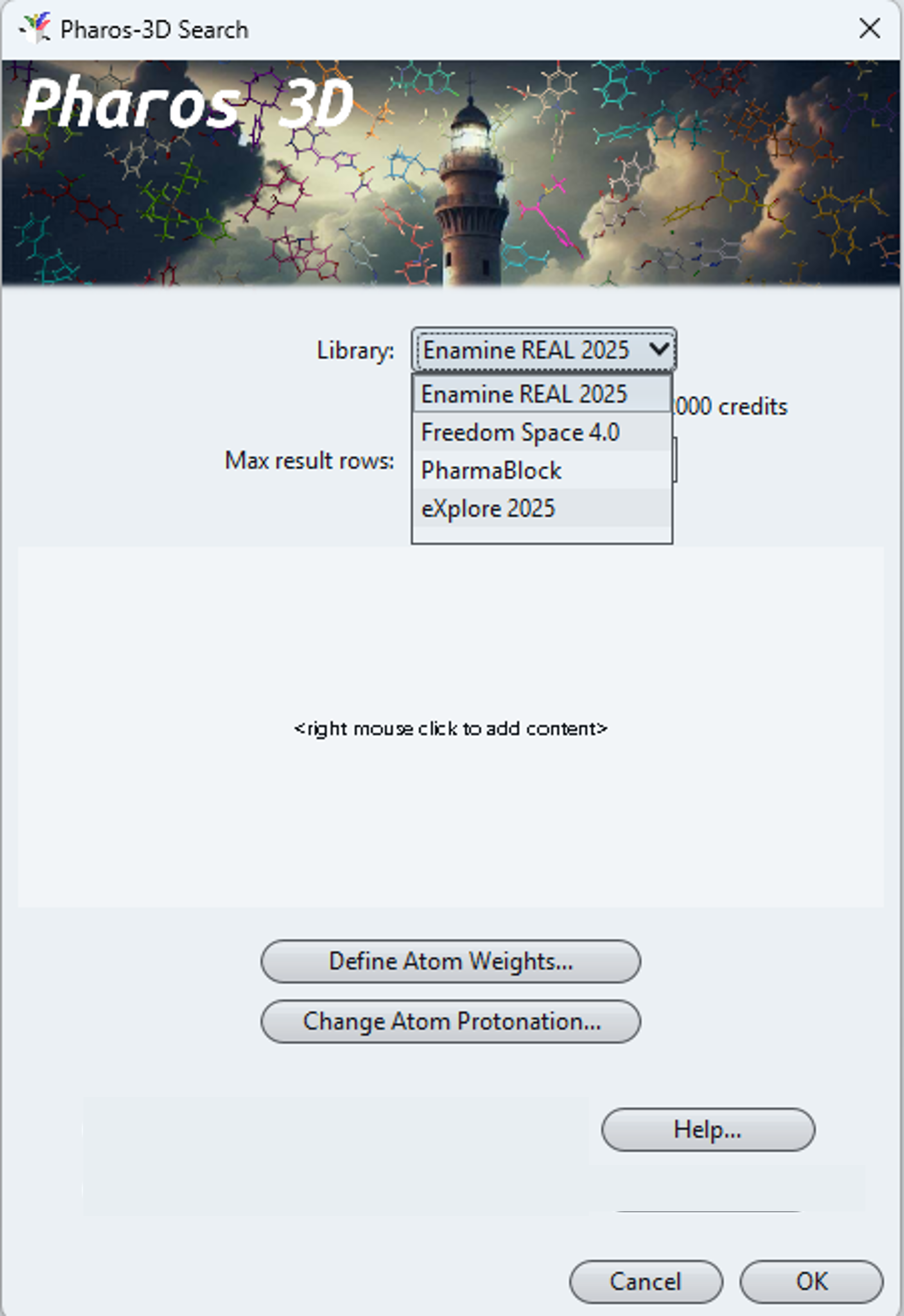 Pharos-3D searches are computationally demanding, because they involve the generation of conformers of thousands of partially assembled and also completely enumerated structures. A typical result of a Pharos-3D search contains thousands of molecules with 3-dimensional atom coordinates that match well the query structure. Typically, these molecules are ranked then by another method, e.g. ligand-protein docking, to determine a most promising subset to be ordered for synthesis at the provider of the space. For instance, docking can be performed using DataWarrior directly.