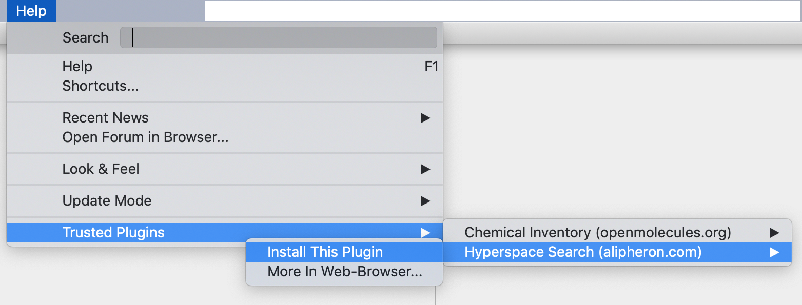 - Restart DataWarrior; a new menu Alipheron has been created. Select Hyperspace Search....