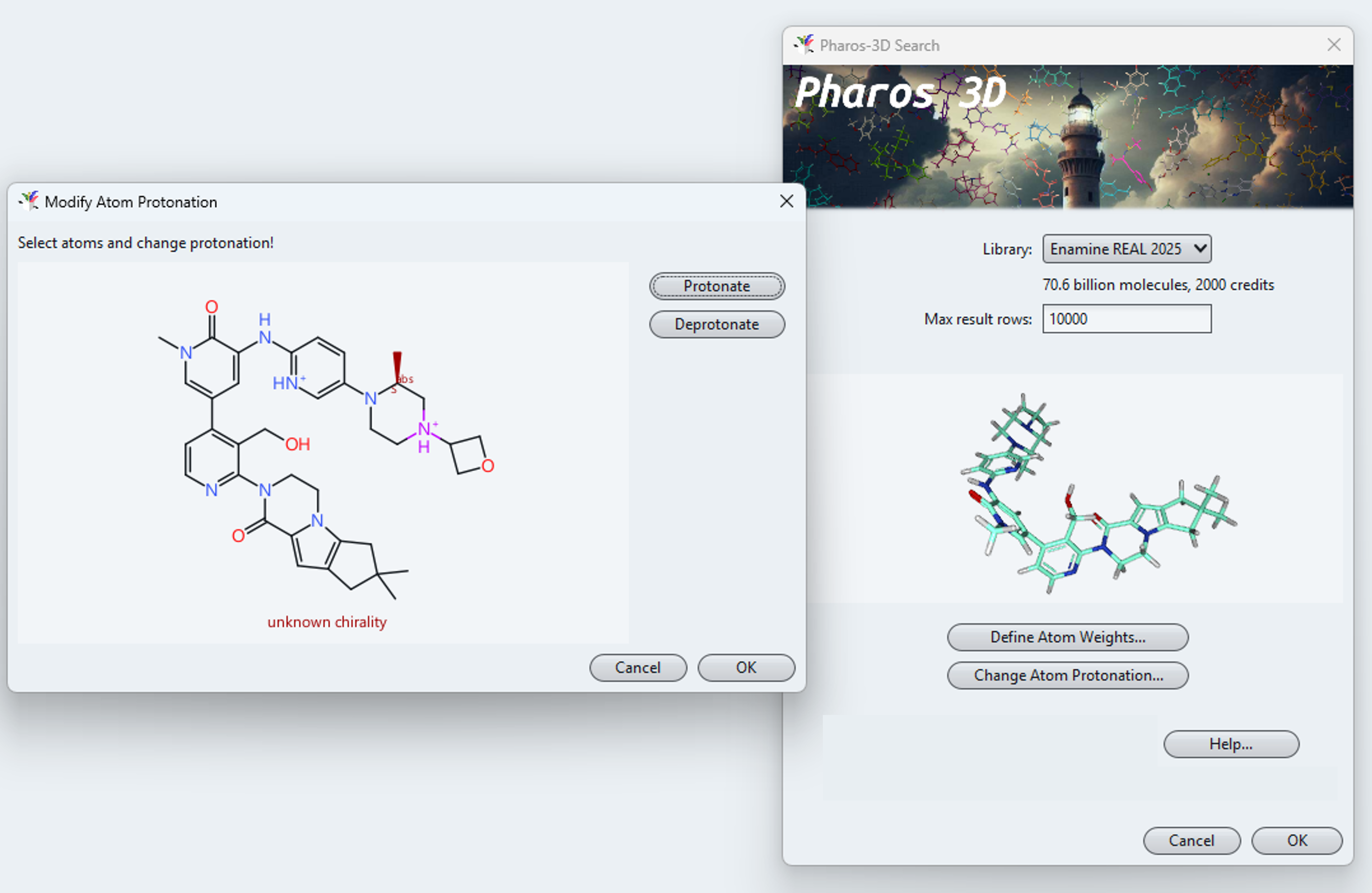 Pharos-3D searches are computationally demanding, because they involve the generation of conformers of thousands of partially assembled and also completely enumerated structures. A typical result of a Pharos-3D search contains thousands of molecules with 3-dimensional atom coordinates that match well the query structure. Typically, these molecules are ranked then by another method, e.g. ligand-protein docking, to determine a most promising subset to be ordered for synthesis at the provider of the space. For instance, docking can be performed using DataWarrior directly.