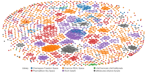 For the six vendor spaces, we selected all Pharos-3D Scores larger than 0.7, and to retrieve structurally diverse hits from the result set, selected only hits with SkelSpheres Similarity smaller than 0.48. These selection rules yielded a set of 1395 hits, approximately 2.3% of all hits. To illustrate the similarity clustering of this selection, see below a similarity chart color-coded with respect to vendor library.
