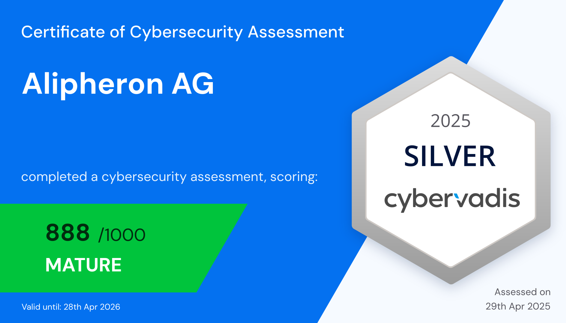 Our infrastructure is hosted on secure servers located in Germany and Finland. These services are provisioned by a reputable German-based data center provider, ensuring that all data handling adheres to rigorous European data protection standards (GDPR). Alipheron is formally certified by CyberVadis, a leading French cybersecurity assessment firm. We have achieved a "Mature" rating with a score of 888 out of 1000, reflecting our high standard of cybersecurity readiness.